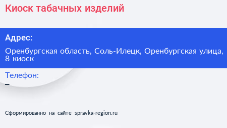 Киоск табачных изделий по адресу Оренбургская область, Соль-Илецк, Оренбургская улица, 8 киоск в дальнейшем Организация, размещена в следующих категориях: