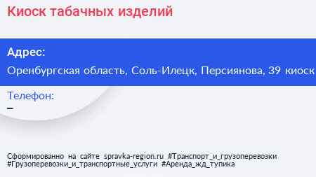 Киоск табачных изделий по адресу Оренбургская область, Соль-Илецк, Персиянова, 39 киоск в дальнейшем Организация, размещена в следующих категориях: