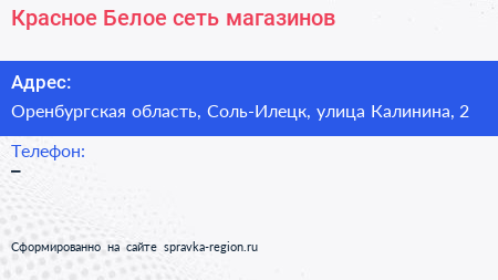 Красное & Белое, сеть магазинов по адресу Оренбургская область, Соль-Илецк, улица Калинина, 2 в дальнейшем Организация, размещена в следующих категориях: