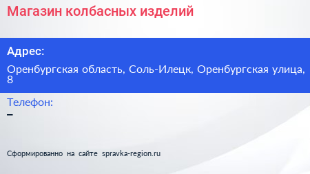 Магазин колбасных изделий по адресу Оренбургская область, Соль-Илецк, Оренбургская улица, 8 в дальнейшем Организация, размещена в следующих категориях:
