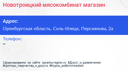 Новотроицкий мясокомбинат, магазин по адресу Оренбургская область, Соль-Илецк, Персиянова, 2а в дальнейшем Организация, размещена в следующих категориях: