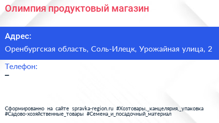 Олимпия, продуктовый магазин по адресу Оренбургская область, Соль-Илецк, Урожайная улица, 2 в дальнейшем Организация, размещена в следующих категориях: