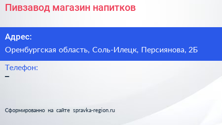 Пивзавод, магазин напитков по адресу Оренбургская область, Соль-Илецк, Персиянова, 2Б в дальнейшем Организация, размещена в следующих категориях: