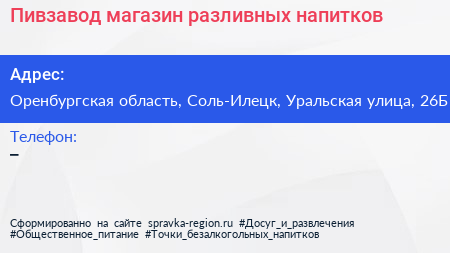 Пивзавод, магазин разливных напитков по адресу Оренбургская область, Соль-Илецк, Уральская улица, 26Б в дальнейшем Организация, размещена в следующих категориях: