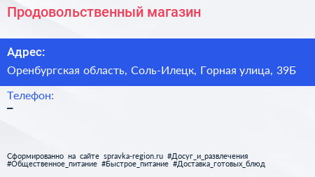 Продовольственный магазин по адресу Оренбургская область, Соль-Илецк, Горная улица, 39Б в дальнейшем Организация, размещена в следующих категориях: