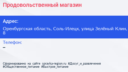 Продовольственный магазин по адресу Оренбургская область, Соль-Илецк, улица Зелёный Клин, 8 в дальнейшем Организация, размещена в следующих категориях: