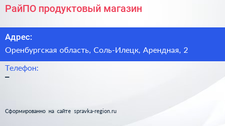 РайПО, продуктовый магазин по адресу Оренбургская область, Соль-Илецк, Арендная, 2 в дальнейшем Организация, размещена в следующих категориях:
