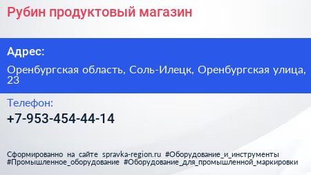 Рубин, продуктовый магазин по адресу Оренбургская область, Соль-Илецк, Оренбургская улица, 23 в дальнейшем Организация, размещена в следующих категориях: