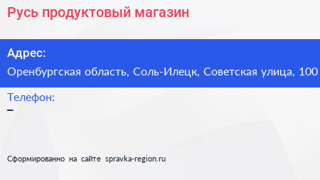 Русь, продуктовый магазин по адресу Оренбургская область, Соль-Илецк, Советская улица, 100 в дальнейшем Организация, размещена в следующих категориях: