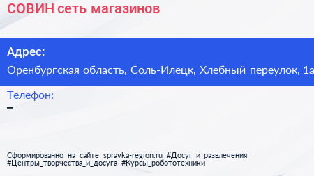 СОВИН, сеть магазинов по адресу Оренбургская область, Соль-Илецк, Хлебный переулок, 1а в дальнейшем Организация, размещена в следующих категориях: