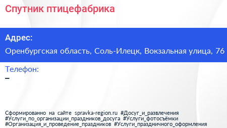 Спутник, птицефабрика по адресу Оренбургская область, Соль-Илецк, Вокзальная улица, 76 в дальнейшем Организация, размещена в следующих категориях: