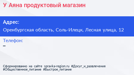 У Аяна, продуктовый магазин по адресу Оренбургская область, Соль-Илецк, Лесная улица, 12 в дальнейшем Организация, размещена в следующих категориях: