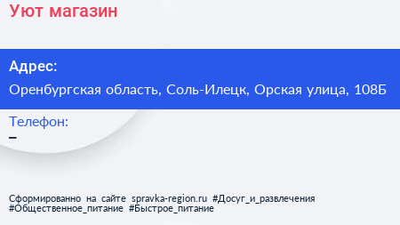 Уют, магазин по адресу Оренбургская область, Соль-Илецк, Орская улица, 108Б в дальнейшем Организация, размещена в следующих категориях: