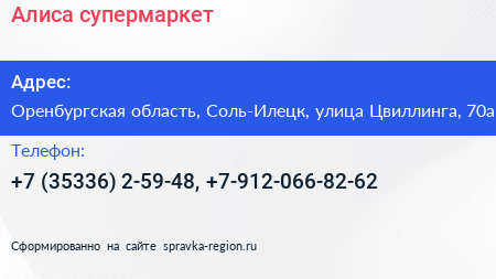 Алиса, супермаркет по адресу Оренбургская область, Соль-Илецк, улица Цвиллинга, 70а в дальнейшем Организация, размещена в следующих категориях: