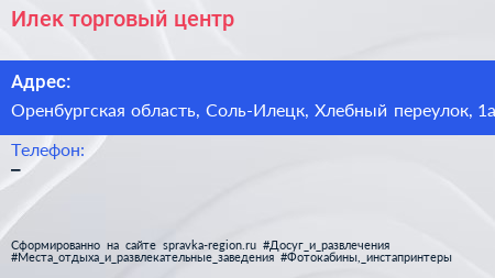 Илек, торговый центр по адресу Оренбургская область, Соль-Илецк, Хлебный переулок, 1а в дальнейшем Организация, размещена в следующих категориях:
