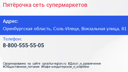 Пятёрочка, сеть супермаркетов по адресу Оренбургская область, Соль-Илецк, Вокзальная улица, 81 в дальнейшем Организация, размещена в следующих категориях: