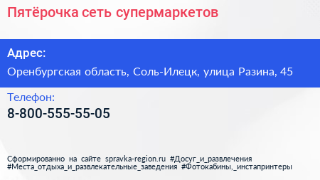 Пятёрочка, сеть супермаркетов по адресу Оренбургская область, Соль-Илецк, улица Разина, 45 в дальнейшем Организация, размещена в следующих категориях: