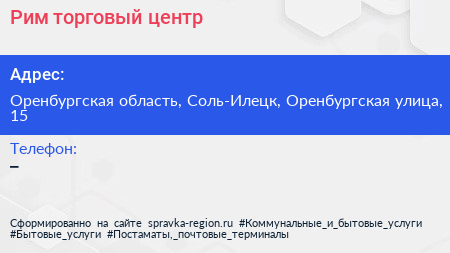 Рим, торговый центр по адресу Оренбургская область, Соль-Илецк, Оренбургская улица, 15 в дальнейшем Организация, размещена в следующих категориях:
