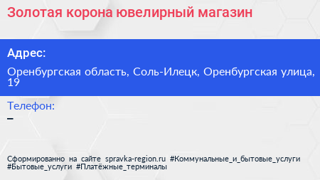 Золотая корона, ювелирный магазин по адресу Оренбургская область, Соль-Илецк, Оренбургская улица, 19 в дальнейшем Организация, размещена в следующих категориях: