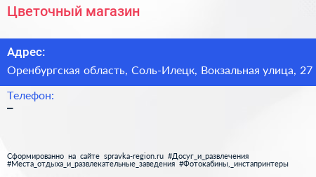 Цветочный магазин по адресу Оренбургская область, Соль-Илецк, Вокзальная улица, 27 в дальнейшем Организация, размещена в следующих категориях:
