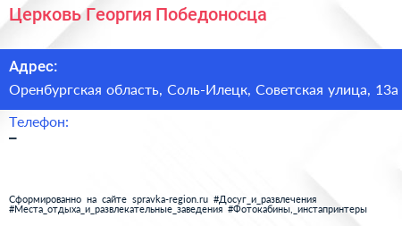 Церковь Георгия Победоносца по адресу Оренбургская область, Соль-Илецк, Советская улица, 13а в дальнейшем Организация, размещена в следующих категориях: