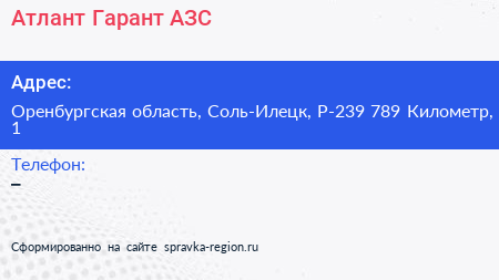Атлант Гарант, АЗС по адресу Оренбургская область, Соль-Илецк, Р-239 789 Километр, 1 в дальнейшем Организация, размещена в следующих категориях: