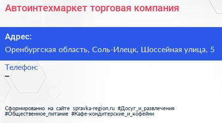 Автоинтехмаркет, торговая компания по адресу Оренбургская область, Соль-Илецк, Шоссейная улица, 5 в дальнейшем Организация, размещена в следующих категориях: