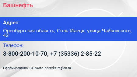 Башнефть по адресу Оренбургская область, Соль-Илецк, улица Чайковского, 42 в дальнейшем Организация, размещена в следующих категориях: