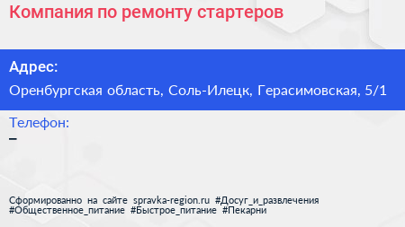 Компания по ремонту стартеров по адресу Оренбургская область, Соль-Илецк, Герасимовская, 5/1 в дальнейшем Организация, размещена в следующих категориях: