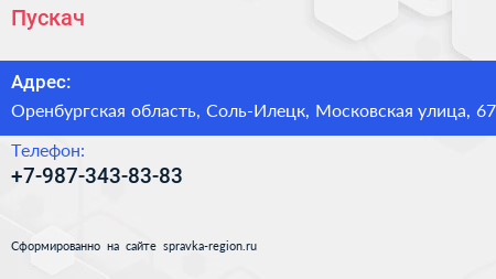 Пускач+ по адресу Оренбургская область, Соль-Илецк, Московская улица, 67 в дальнейшем Организация, размещена в следующих категориях: