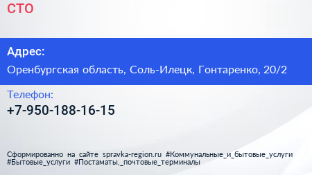 СТО по адресу Оренбургская область, Соль-Илецк, Гонтаренко, 20/2 в дальнейшем Организация, размещена в следующих категориях: