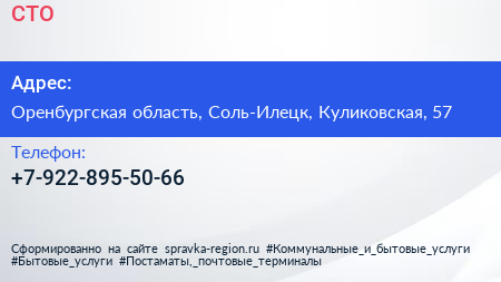 СТО по адресу Оренбургская область, Соль-Илецк, Куликовская, 57 в дальнейшем Организация, размещена в следующих категориях: