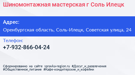 Шиномонтажная мастерская, г. Соль-Илецк по адресу Оренбургская область, Соль-Илецк, Советская улица, 24 в дальнейшем Организация, размещена в следующих категориях: