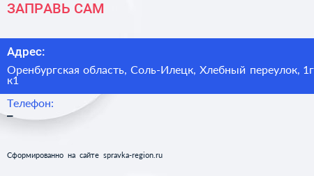 ЗАПРАВЬ САМ по адресу Оренбургская область, Соль-Илецк, Хлебный переулок, 1г к1 в дальнейшем Организация, размещена в следующих категориях: