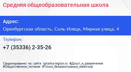 Средняя общеобразовательная школа по адресу Оренбургская область, Соль-Илецк, Мирная улица, 4 в дальнейшем Организация, размещена в следующих категориях: