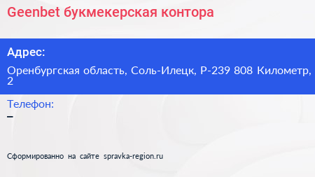 Geenbet, букмекерская контора по адресу Оренбургская область, Соль-Илецк, Р-239 808 Километр, 2 в дальнейшем Организация, размещена в следующих категориях: