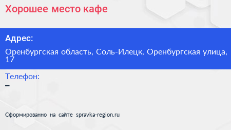 Хорошее место, кафе по адресу Оренбургская область, Соль-Илецк, Оренбургская улица, 17 в дальнейшем Организация, размещена в следующих категориях: