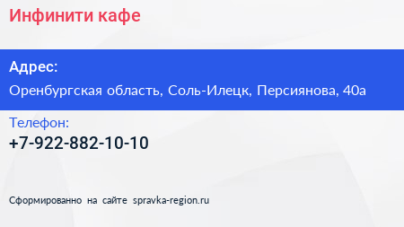 Инфинити, кафе по адресу Оренбургская область, Соль-Илецк, Персиянова, 40а в дальнейшем Организация, размещена в следующих категориях: