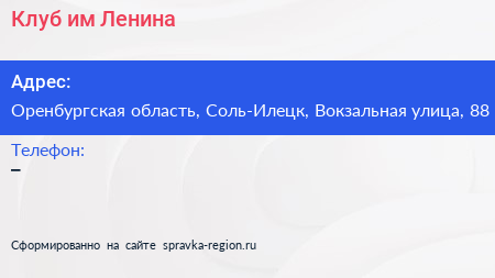 Клуб им. Ленина по адресу Оренбургская область, Соль-Илецк, Вокзальная улица, 88 в дальнейшем Организация, размещена в следующих категориях: