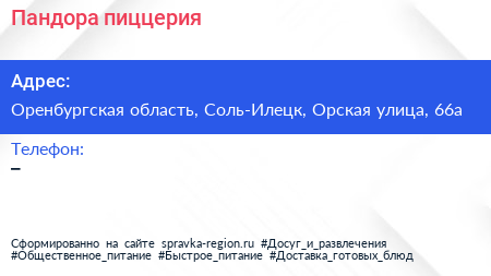 Пандора, пиццерия по адресу Оренбургская область, Соль-Илецк, Орская улица, 66а в дальнейшем Организация, размещена в следующих категориях: