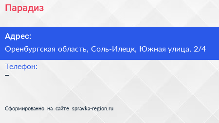 Парадиз по адресу Оренбургская область, Соль-Илецк, Южная улица, 2/4 в дальнейшем Организация, размещена в следующих категориях: