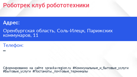 Роботрек, клуб робототехники по адресу Оренбургская область, Соль-Илецк, Парижских коммунаров, 11 в дальнейшем Организация, размещена в следующих категориях:
