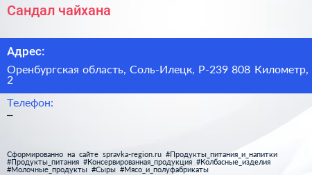 Сандал, чайхана по адресу Оренбургская область, Соль-Илецк, Р-239 808 Километр, 2 в дальнейшем Организация, размещена в следующих категориях: