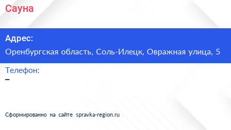 Сауна по адресу Оренбургская область, Соль-Илецк, Овражная улица, 5 в дальнейшем Организация, размещена в следующих категориях: