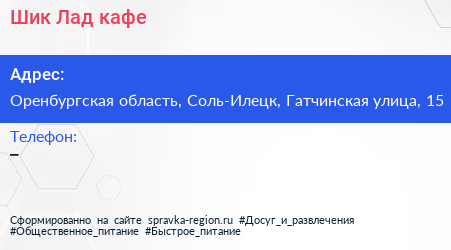 Шик & Лад, кафе по адресу Оренбургская область, Соль-Илецк, Гатчинская улица, 15 в дальнейшем Организация, размещена в следующих категориях:
