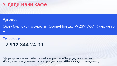 У дяди Вани, кафе по адресу Оренбургская область, Соль-Илецк, Р-239 767 Километр, 1 в дальнейшем Организация, размещена в следующих категориях: