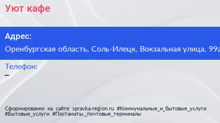 Уют, кафе по адресу Оренбургская область, Соль-Илецк, Вокзальная улица, 99а в дальнейшем Организация, размещена в следующих категориях:
