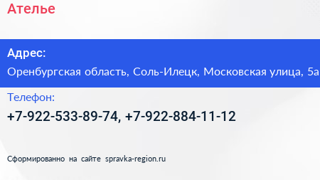 Ателье по адресу Оренбургская область, Соль-Илецк, Московская улица, 5а в дальнейшем Организация, размещена в следующих категориях:
