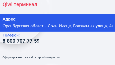 Qiwi, терминал по адресу Оренбургская область, Соль-Илецк, Вокзальная улица, 4а в дальнейшем Организация, размещена в следующих категориях: