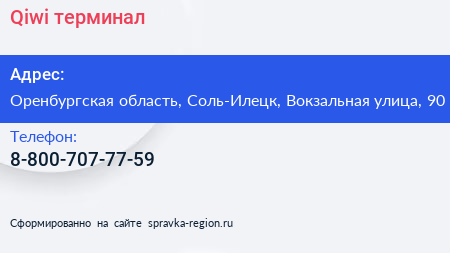 Qiwi, терминал по адресу Оренбургская область, Соль-Илецк, Вокзальная улица, 90 в дальнейшем Организация, размещена в следующих категориях: